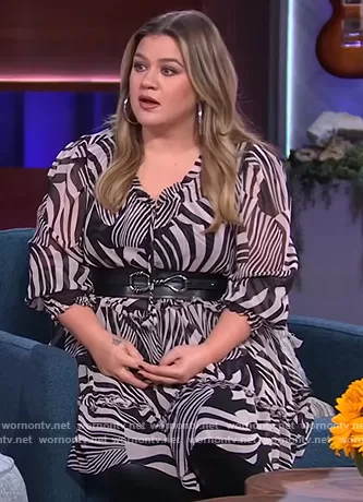 Kelly Clarkson on The Kelly Clarkson Show on NBC was spotted wearing this abstract ruffle mini dress on The Kelly Clarkson Show on Mar 16 2022's episode. Kelly's Dress is the Marisa Dress by Misa Los Angeles.