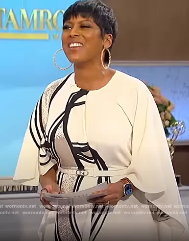 Tamron Hall on Tamron Hall Show on ABC was spotted wearing this white printed cape mini dress on Tamron Hall Show on Mar 16 2022's episode. Tamron's Dress is the Cady Cape Mini Dress by Fendi . Tamron's Belt is the White Leather Belt by Fendi.