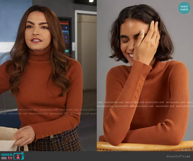 Allegra Garcia (played by Kayla Compton) on The Flash on The CW was spotted wearing this brown turtleneck and plaid pants on The Flash on episode 'Lockdown' (8x07) in Mar 2022. Allegra's Top is the Button-Sleeve Turtleneck in Pecan by Maeve at Anthropologie . Allegra's Pants is the Stretch Plaid Super High-Waisted Flare Pant by American Eagle.