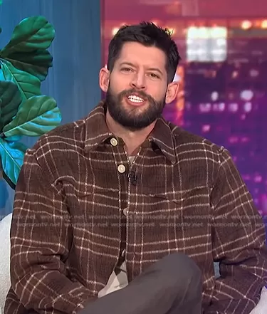 on E! News on E! was spotted wearing this brown plaid shirt on E! News Nightly Pop on Mar 17 2022's episode. 's Shirt is the Nikko Plaid Fleece Button-Up Shirt Jacket by All Saints.