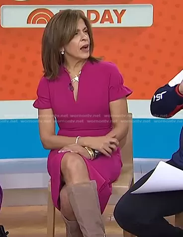 Hoda Kotb on Today on NBC was spotted wearing this pink ruffle sleeve v-neck dress on Today on Mar 15 2022's episode. Hoda's Dress is the Patel Sheath Dress by Black Halo.