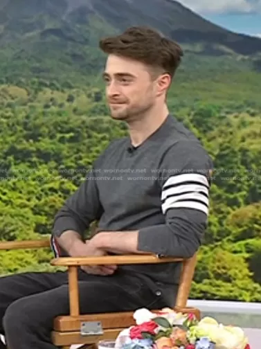 on Today on NBC was spotted wearing this grey striped-sleeve sweater on Today on Mar 17 2022's episode. 's Sweater is the Four-bar Merino Sweater by Thom Browne.