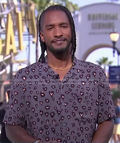 Scott Evans on Access Hollywood on NBC was spotted wearing this grey heart print shirt on Access Hollywood on Mar 17 2022's episode. Scott's Shirt is the Romansu Heart Print Short Sleeve Shirt by All Saints.