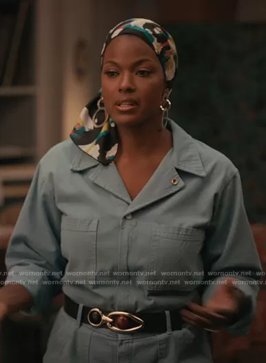 Vivian Banks (played by Cassandra Freeman) on Bel-Air on Peacock was spotted wearing this blue jumpsuit on Bel-Air on episode 'No One Wins When The Family Feuds' (1x08) in Mar 2022. Viv's Belt is the Seeing Eye Leather Belt w/ Stones by Lafayette 148 New York . Viv's Shoes is the Hilda Clog by Sam Edelman.