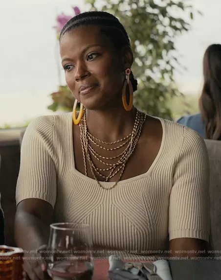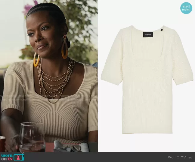 Vivian Banks (played by Cassandra Freeman) on Bel-Air on Peacock was spotted wearing this ivory ribbed square neck top on Bel-Air on episode 'No One Wins When The Family Feuds' (1x08) in Mar 2022. Viv's Top is the Ribbed stretch-knit short-sleeved top by The Kooples.