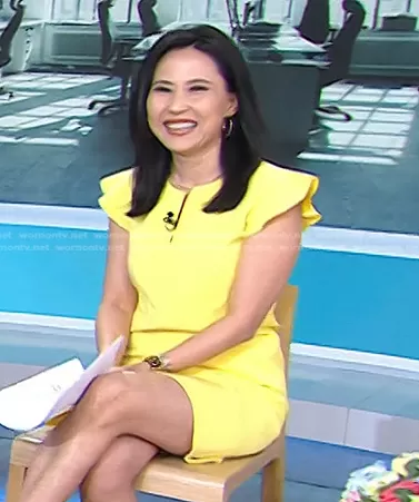 Vicky Nguyen on Today on NBC was spotted wearing this yellow flutter sleeve mini dress on Today on Jul 03 2023's episode. Vicky's Dress is the Flutter Sheath Dress by Ann Taylor.