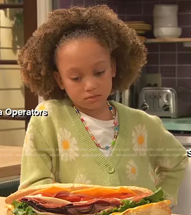 Alice Baxter (played by Mykal-Michelle Harris) on Ravens Home on Disney was spotted wearing this light green floral cardigan on Ravens Home on episode 'The Big Sammich' (5x02) in Mar 2022. Alice's Sweater is the Girls Floral Pattern Button Front Cardigan by Shein.
