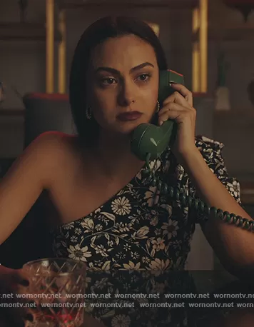 Veronica Lodge (played by Camila Mendes) on Riverdale on The CW was spotted wearing this black floral print one shoulder top on Riverdale on episode 'Unbelievable' (6x06) in Mar 2022. Veronica's Bodysuit is the Somethin Bout You Bodysuit by Free People.