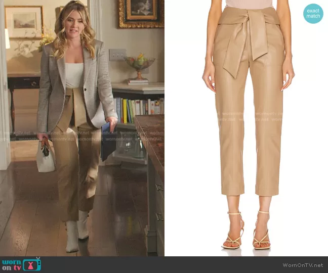 Amanda Carrington (played by Eliza Bennett) on Dynasty on The CW was spotted wearing this beige tie waist leather pants on Dynasty on episode 'Go Catch Your Horse' (5x04) in Mar 2022. Amanda's Pants is the Tessa Vegan Leather Pant by Jonathan Simkhai . Amanda's Shoes is the Roni Ankle Boots by Balmain.