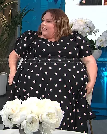 on E! News on E! was spotted wearing this black strawberry print dress on E! News Daily Pop on Mar 21 2022's episode. 's Dress is the Strawberry Print Ohara Swing Dress by Unique Vintage.