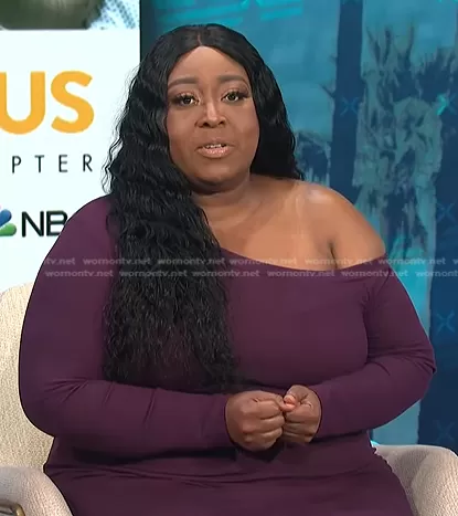 Loni Love on E! News on E! was spotted wearing this Loni’s purple one off-shoulder dress on E! News Daily Pop on episode 'D.W.B.' (2x13) in Mar 2022. Loni's Dress is the One Shoulder Fitted Dress by Eloquii.