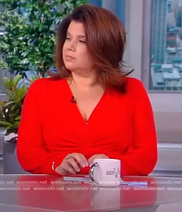Ana Navarro on The View on ABC was spotted wearing this red twist front dress on The View on Mar 21 2022's episode. Ana's Dress is the Knot Front Pleated Skirt Dress by Eloquii.
