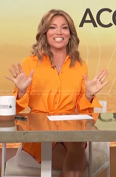 Kit Hoover on Access Hollywood on NBC was spotted wearing this orange shirtdress on Access Hollywood on Sep 16 2024's episode. Kit's Dress is the Short Dress with Ruching by Zara.