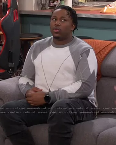 Marty (played by Marcel Spears) on The Neighborhood on CBS was spotted wearing this grey argyle sweater on The Neighborhood on episode 'Welcome to the Man Code' (4x16) in Mar 2022. Marty's Sweater is the Avebury Argyle Sweater by Ted Baker.
