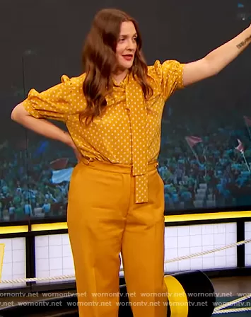 Drew Barrymore on The Drew Barrymore Show on CBS was spotted wearing this yellow polka dot print blouse on The Drew Barrymore Show on Mar 22 2022's episode. Drew's Top is the Lavalliere Blouse by Celine . Drew's Pants is the Vesta high-rise flared pants by Gabriela Hearst.