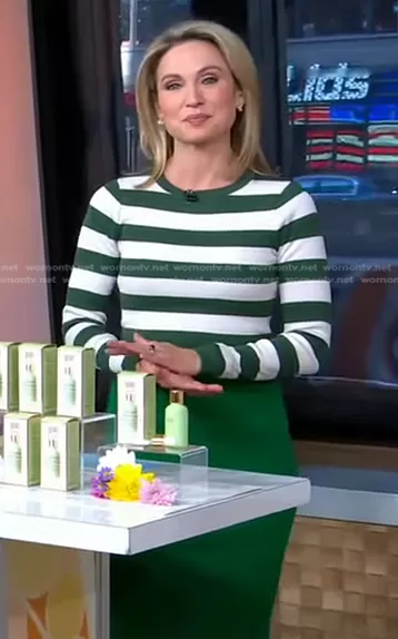 Amy Robach on Good Morning America on ABC was spotted wearing this green striped sweater and knit skirt on Good Morning America on Mar 22 2022's episode. Amy's Sweater is the Rib Knit Sweater by Zara . Amy's Skirt is the Knit Midi Pencil Skirt by Zara.