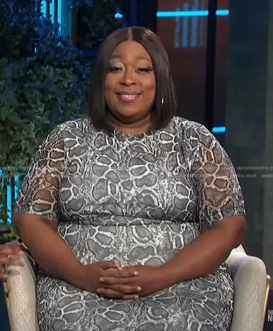 Loni Love on E! News on E! was spotted wearing this grey snake print dress on E! News Daily Pop on Mar 22 2022's episode. Loni's Dress is the Trendy Plus Size Mesh Midi Dress by Nina Parker.