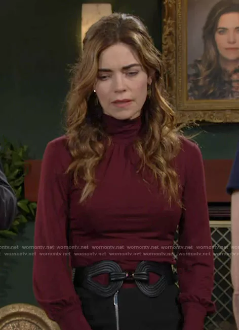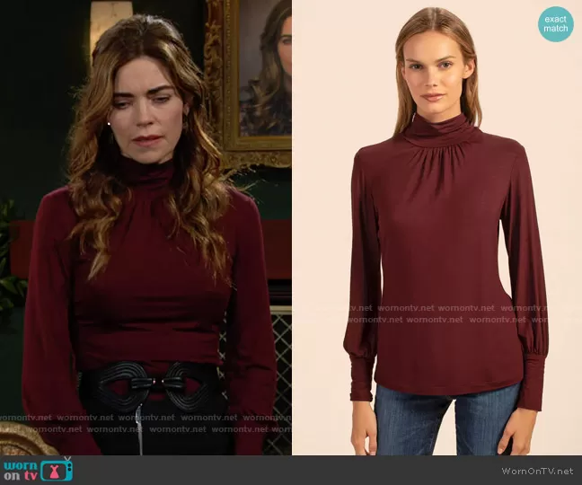 Victoria Newman (played by Amelia Heinle) on The Young and the Restless on CBS was spotted wearing this red mock neck top on The Young and the Restless on Mar 22 2022's episode. Victoria's Top is the James Top by Trina Turk.