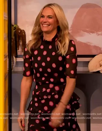 on The Drew Barrymore Show on CBS was spotted wearing this Molly Sims’ polka dot ruffle dress on The Drew Barrymore Show on Mar 23 2022's episode. 's Dress is the Isa Polka Dot Devoré Satin Dress by Saloni.
