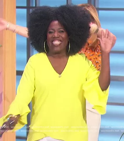 Sheryl Underwood on The Talk on CBS was spotted wearing this yellow ruffle sleeve top on The Talk on Mar 23 2022's episode. Sheryl's Top is the Flutter Sleeve Tunic by Vince Camuto.