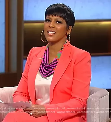Tamron Hall on Tamron Hall Show on ABC was spotted wearing this coral blazer and pants on Tamron Hall Show on Mar 23 2022's episode. Tamron's Blazer is the One-Button Jacket by Alexander McQueen . Tamron's Pants is the Leaf Crepe Cigarette Trousers by Alexander McQueen.