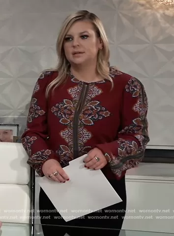 Maxie Jones (played by Kirsten Storms) on General Hospital on ABC was spotted wearing this red floral embroidered blouse on General Hospital on Mar 24 2022's episode. Maxie's Top is the Paisley Keyhole Top by BCBGMAXAZRIA.