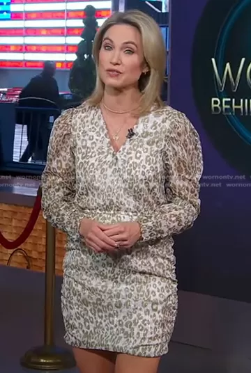 Amy Robach on Good Morning America on ABC was spotted wearing this leopard print puff sleeve dress on Good Morning America on Mar 24 2022's episode. Amy's Dress is the Deena Print Dress by Walter Baker.
