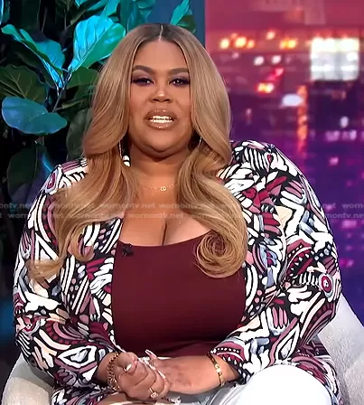 Nina Parker on E! News on E! was spotted wearing this abstract print blazer on E! News Nightly Pop on Mar 24 2022's episode. Nina's Jacket is the Trendy Plus Size Printed Blazer in Multi-Color Abstract Print by Nina Parker.