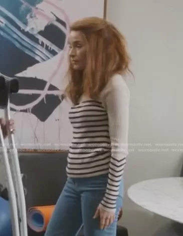 (played by ) on Greys Anatomy on ABC was spotted wearing this Megan’s beige striped sweater on Greys Anatomy on episode 'Put the Squeeze on Me' (18x13) in Mar 2022. 's Sweater is the Kate Striped Ribbed Sweater by Rag & Bone . 's Bag is the Studded Leather Shoulder Bag by Rebecca Minkoff.