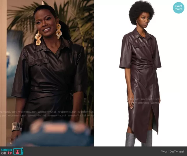 Vivian Banks (played by Cassandra Freeman) on Bel-Air on Peacock was spotted wearing this leather wrap dress on Bel-Air on episode 'Can't Knock The Hustle' (1x09) in Mar 2022. Viv's Dress is the Lais Vegan Leather Dress by Nanushka.