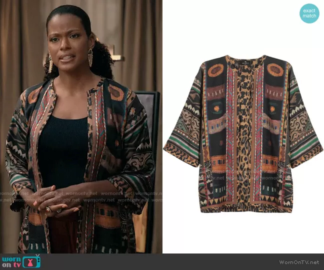 Vivian Banks (played by Cassandra Freeman) on Bel-Air on Peacock was spotted wearing this mixed print jacket on Bel-Air on episode 'Can't Knock The Hustle' (1x09) in Mar 2022. Viv's Jacket is the Graphic Print Kimono Jacket by Etro.