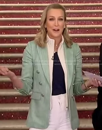 Lara Spencer on Good Morning America on ABC was spotted wearing this green double breasted blazer on Good Morning America on Mar 25 2022's episode. Lara's Jacket is the Beacon Dickey Jacket by Veronica Beard.