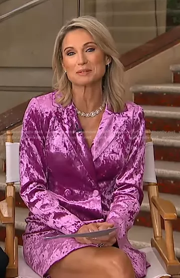 Amy Robach on Good Morning America on ABC was spotted wearing this pink velvet blazer dress on Good Morning America on Mar 25 2022's episode. Amy's Dress is the Rachel Crushed Velvet Blazer Dress by Adelyn Rae.