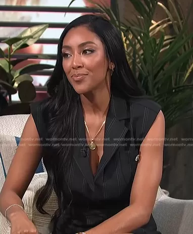 on E! News on E! was spotted wearing this Tayshia’s black pinstripe sleeveless blazer dress on E! News Daily Pop on Mar 25 2022's episode. 's Dress is the Vaiana Sleeveless Coat Dress by Sandro.