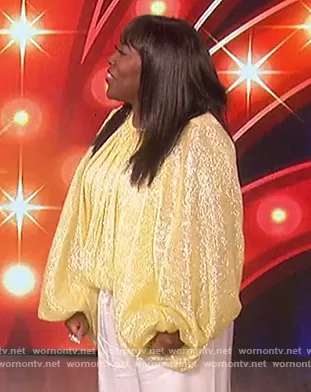 Sheryl Underwood on The Talk on CBS was spotted wearing this yellow metallic top on The Talk on Mar 26 2022's episode. Sheryl's Bodysuit is the Violet Metallic Chiffon Bodysuit by Halston.