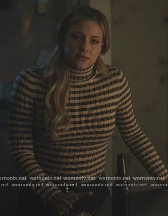 Betty Cooper (played by Lili Reinhart) on Riverdale on The CW was spotted wearing this stripe turtleneck sweater on Riverdale on episode 'Death at a Funeral' (6x07) in Mar 2022. Betty's Sweater is the Maeve Button Sleeve Turtleneck by Anthropologie .