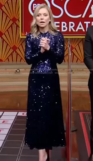 Kelly Ripa on Live with Kelly and Mark on Disney ABC Home Entertainment was spotted wearing this sequin long sleeve maxi dress on Live with Kelly and Ryan on Mar 26 2022's episode. Kelly's Dress is the Minimal Sequin Midi Dress by Whistles.