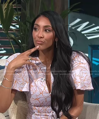 on E! News on E! was spotted wearing this lilac floral puff sleeve dress on E! News Daily Pop on Mar 28 2022's episode. 's Dress is the Virginia Belted Floral Puff-Sleeve Minidress by Jonathan Simkhai.