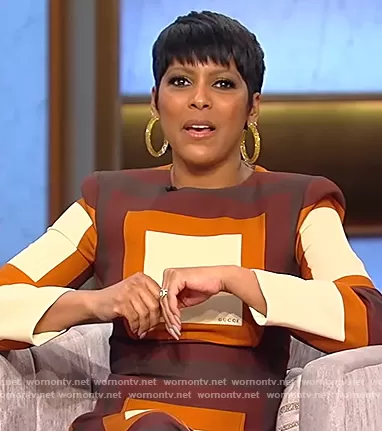 Tamron Hall on Tamron Hall Show on ABC was spotted wearing this geometric print dress on Tamron Hall Show on Mar 28 2022's episode. Tamron's Dress is the Printed wool-blend twill maxi dress by Gucci.