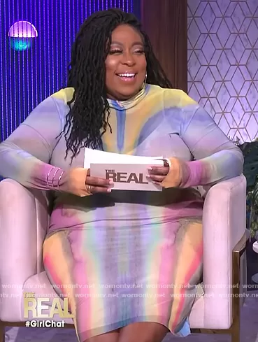 Loni Love on The Real on BETher was spotted wearing this tie dye print dress on The Real on Mar 29 2022's episode. Loni's Dress is the Shailene Long Sleeve Mesh Midi Dress by AFRM.