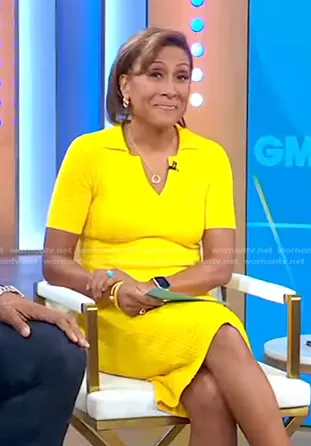 Robin Roberts on Good Morning America on ABC was spotted wearing this yellow knit polo dress on Good Morning America on Mar 29 2022's episode. Robin's Dress is the Short Sleeve Polo Dress by Adam Lippes.