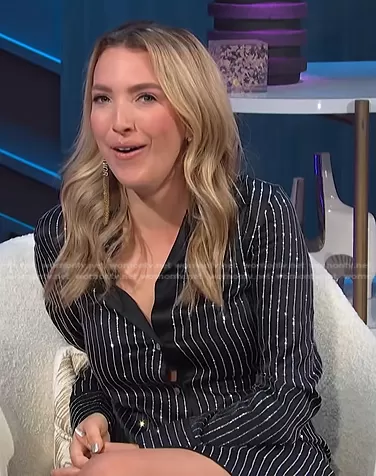 on E! News on E! was spotted wearing this Jackie Schimmel’s black crystal striped shirtdress on E! News Nightly Pop on Mar 29 2022's episode. 's Dress is the Slim Shirt Dress with Crystal Hotfix by Alexander Wang.