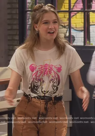 Presley (played by Jayden Bartels) on Side Hustle on Nickeldeon was spotted wearing this tiger graphic tee on Side Hustle on episode 'Return of Uncle Nedward' (2x11) in Mar 2022. Presley's Top is the Tiger Bolt Graphic Tee by Chaser.