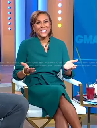 Robin Roberts on Good Morning America on ABC was spotted wearing this green v-neck belted dress on Good Morning America on Mar 30 2022's episode. Robin's Dress is the Kirsty Belted Dress by Hobbs London.