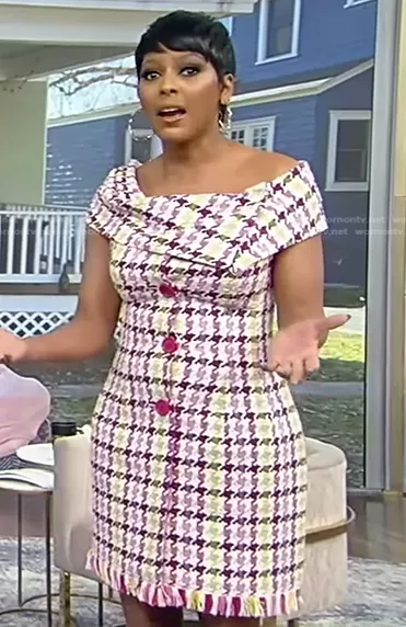 Tamron Hall on Tamron Hall Show on ABC was spotted wearing this houndstooth tweed dress on Tamron Hall Show on Mar 31 2022's episode. Tamron's Dress is the Tweed Off-Shoulder Mini Dress by Oscar de la Renta.