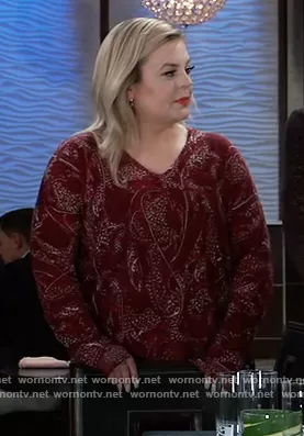 Maxie Jones (played by Kirsten Storms) on General Hospital on ABC was spotted wearing this red paisley print sweater on General Hospital on Apr 01 2022's episode. Maxie's Sweater is the Leaf Print Wool Jumper by Gerard Darel .