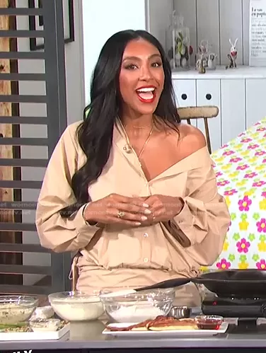 on E! News on E! was spotted wearing this beige ruched shirtdress on E! News Daily Pop on Mar 30 2022's episode. 's Dress is the The Keem Mini Dress by L'Academie.