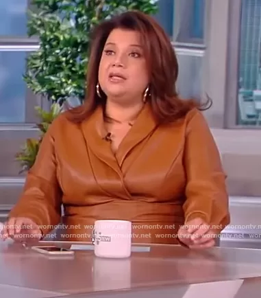 Ana Navarro on The View on ABC was spotted wearing this brown leather wrap dress on The View on Apr 01 2022's episode. Ana's Dress is the Faux Leather Wrap Dress by Eloquii.