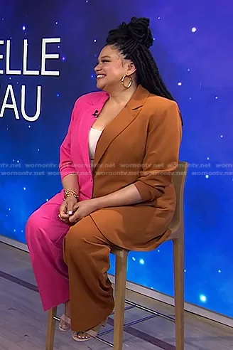 on Today on NBC was spotted wearing this pink and brown colorblock suit on Today on Apr 01 2022's episode. 's Jacket is the Pop Colorblock Blazer by Eloquii . 's Pants is the Pop Colorblock Pant by Eloquii.