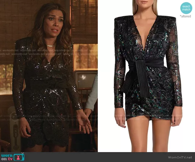 Cristal Jennings (played by Daniella Alonso) on Dynasty on The CW was spotted wearing this sequin floral belted mini dress on Dynasty on episode 'Devoting All of Her Energy to Hate' (5x06) in Apr 2022. Cristal's Dress is the Camille Mini Dress by Zhivago .
